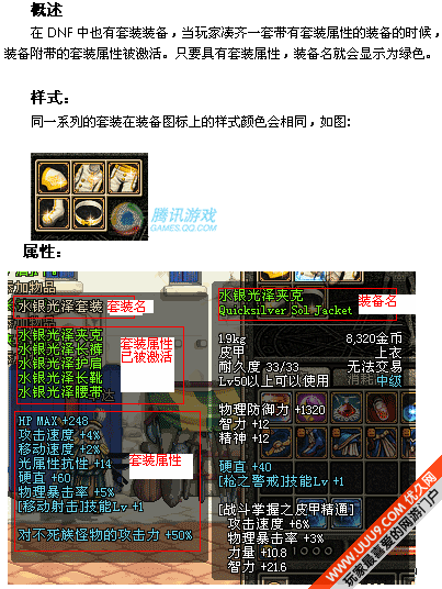 装备的属性可以分为固定属性、附加属性和套装属性。固定属性是同种类的装备必定会有的属性。附加属性是每件装备随机附加的属性。套装属性是当玩家穿戴的装备达到套装要求后被激活的属性。在DNF中同一件装备的附加属性是固定的。